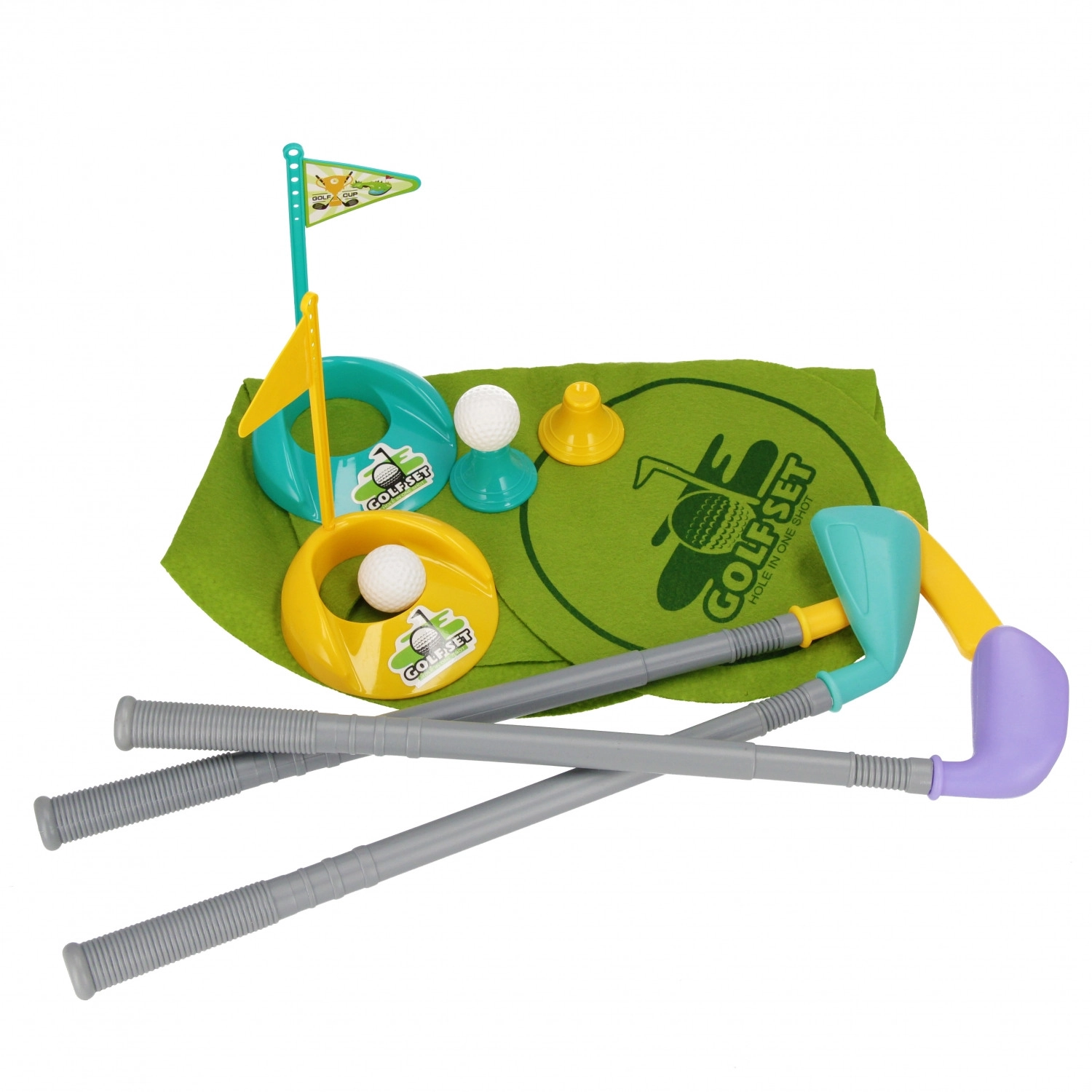 Sve što je djeci potrebno za trenutnu igru: tri palice, dvije rupe sa zastavicama, dvije loptice i podloga za vježbu puttanja.