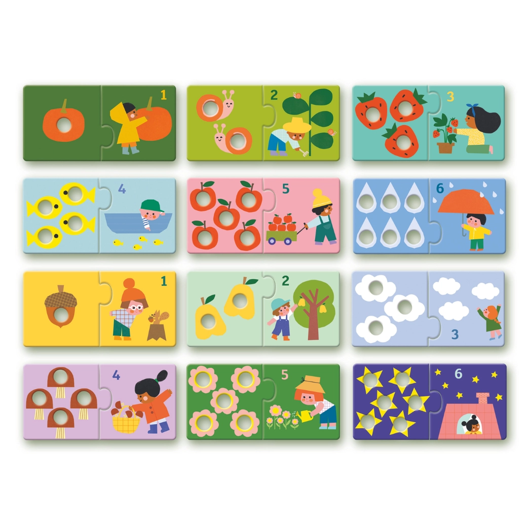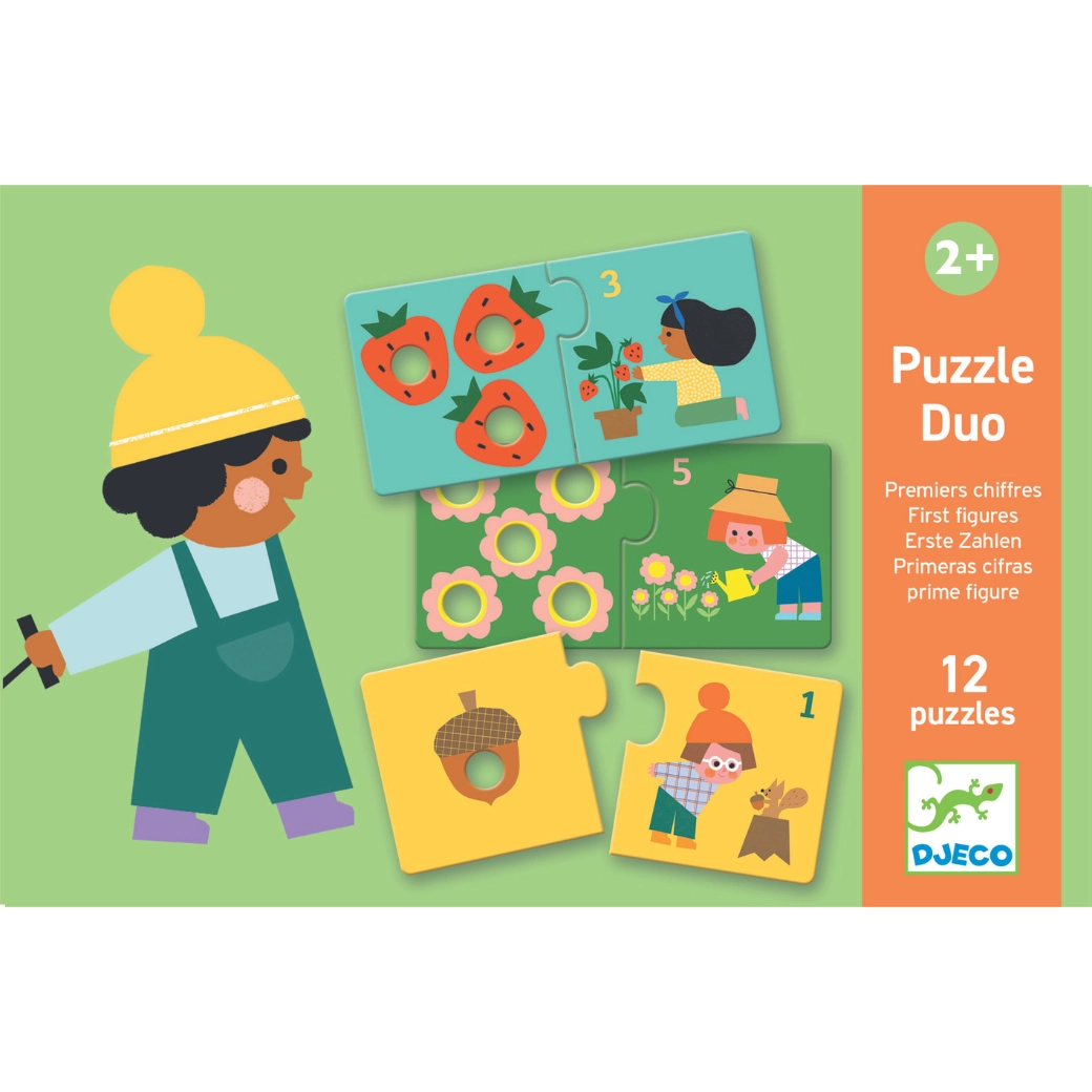 Djeco Duo Puzzle Prvi brojevi je edukativni set u kojem djeca uparuju slike s odgovarajućom znamenkom. Zahvaljujući jednostavnim i šarenim ilustracijama djeca brzo shvaćaju odnos između broja predmeta i broja koji ga označava. Sjajan izbor za predškolce i prve korake u svijet brojeva.