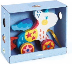 Ovaj veseli povlačni jednorog brenda DJECO idealan je pratitelj za svakodnevno otkrivanje. Djeca će uživati u kretanju dok vuku igračku za uzicu, a izražajne boje i prijateljski izgled potiču njihovu maštu.