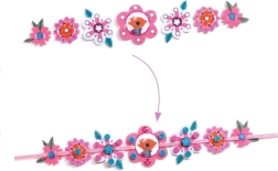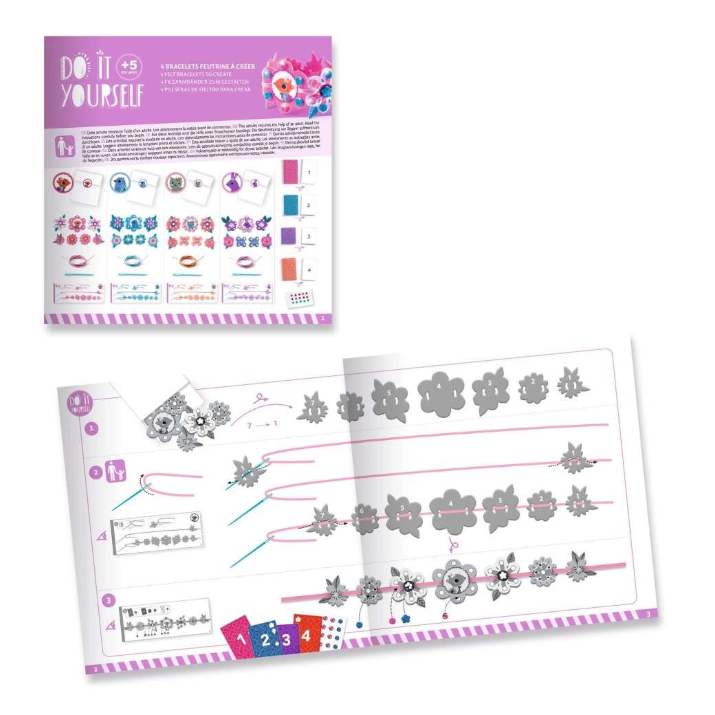 Set sadrži cvjetiće, listiće i preslatke motive od baršunasto mekog filca u intenzivnim bojama. Dijelove je moguće slagati u slojeve i kombinirati za jedinstven izgled svake narukvice.