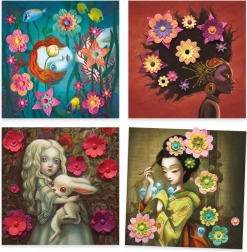 Dio seta su i četiri lijepo ilustrirane kvadratne kartice s motivima portreta i podmorskog svijeta. Svaki motiv možete ukrasiti prema svojoj mašti – od suptilnih detalja do upečatljivih cvjetnih „griva“. Gotove slike izvrsno pristaju kao dekoracija dječje sobe ili poklon.