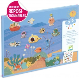 Ovaj kreativni set nudi dvije ilustrirane pozadine – podmorski svijet i šumu s ribnjakom – te arak simpatičnih naljepnica s ribicama, rakom, podmornicom, brodićem, šumskim životinjama i drugim motivima. Djeca mogu naljepnice slobodno premještati i stalno izmišljati nove priče.