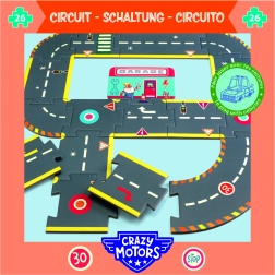 Izgradite djeci vlastiti grad brzine s golemom trkaćom stazom slagalicom CRAZY MOTORS. Čvrsti dijelovi od izdržljivog materijala lako se slažu i stvaraju realistične ceste s voznim trakama, semaforima, znakovima, parkiralištem i kružnim tokom. Idealno za igru s autićima, razvoj fine motorike, mašte i prometne edukacije.