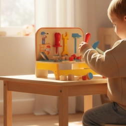 Ova kvalitetna drvena radionica za djecu spaja zabavu i učenje. Djeca mogu zavrtati, lupkati čekićem, stezati ključem i odvijačem, slagati šarene dijelove te vježbati logiku i strpljenje. Zahvaljujući kompaktnim dimenzijama, prikladna je za stol i dječju sobu.