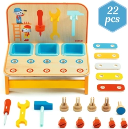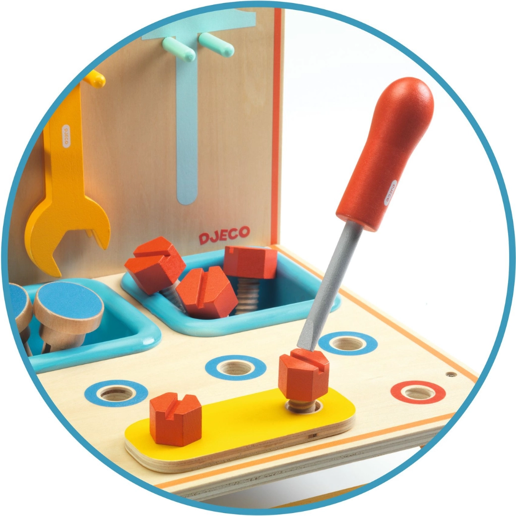 Kompaktna drvena mini radionica od DJeco oduševit će sve male majstore. Nudi bogat set alata, šarene vijke i dijelove za sastavljanje, zahvaljujući kojima djeca razvijaju finu motoriku, koordinaciju oko–ruka i kreativnost kroz igru.