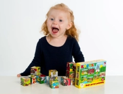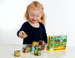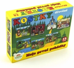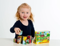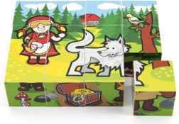 Ovaj set 12 drvenih slikovnih kocaka u čvrstoj kartonskoj kutiji donosi djeci radost slaganja i slobodnog građenja. Od kocaka možete složiti 6 čarobnih bajkovitih scena – od Crvenkapice do Ivice i Marice – a usto od njih graditi dimnjake, dvorce ili ogradice za životinje.