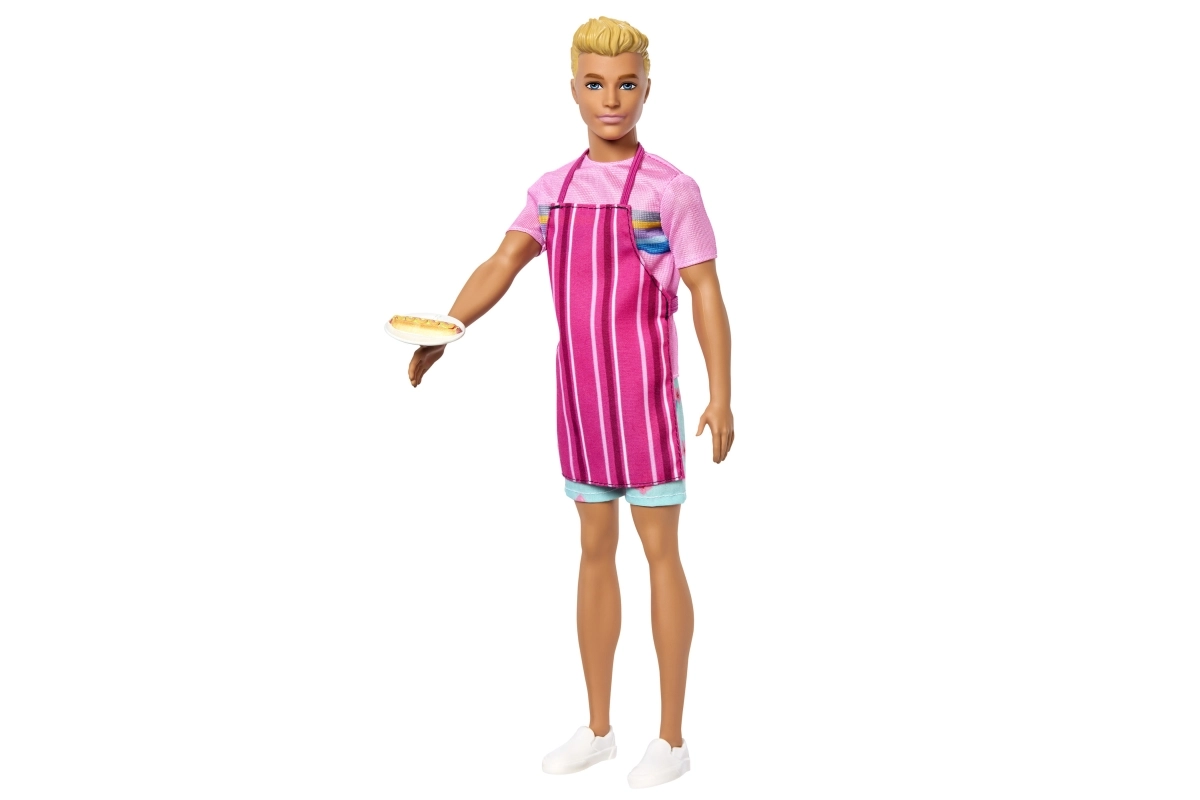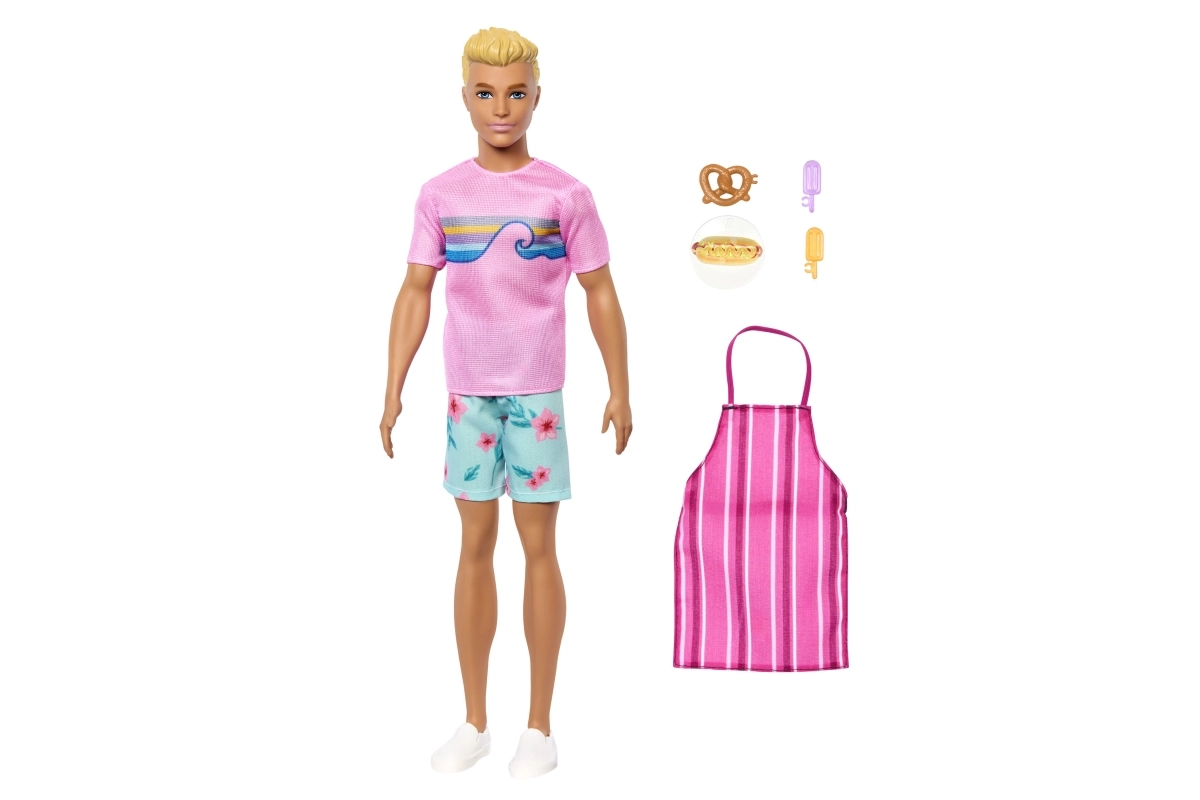 - Lutka Ken, ružičasta majica, cvjetne kratke hlače, bijele cipele, prugasta pregača, perec, hot-dog, 2× sladoled