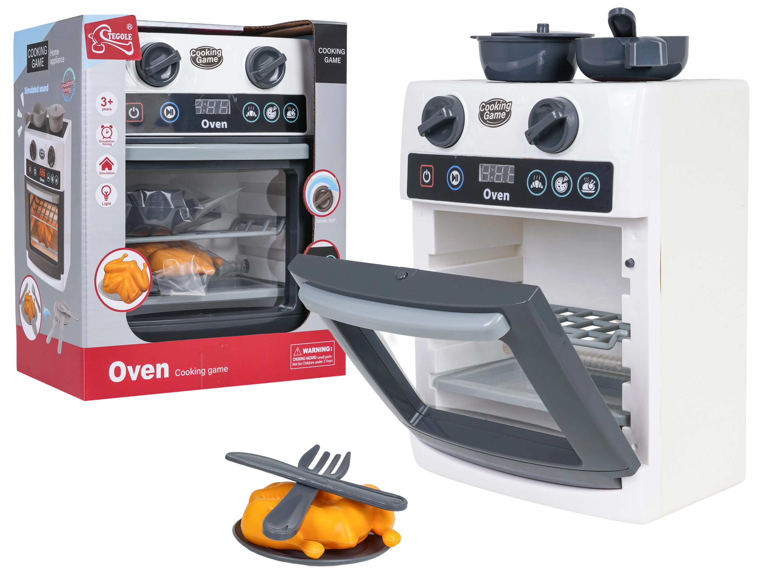 U pakiranju je sve potrebno: atrapa piletine, tava, lonac s poklopcem, tanjurić i pribor za jelo. Zahvaljujući kompaktnim dimenzijama, pećnica se lako smješta na dječji stol ili u kutak za igru i postaje središte maštovitih uloga. Napajanje: 3× AA 1,5 V (nije uključeno).