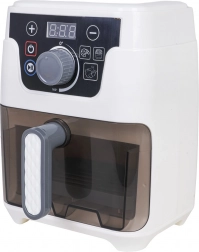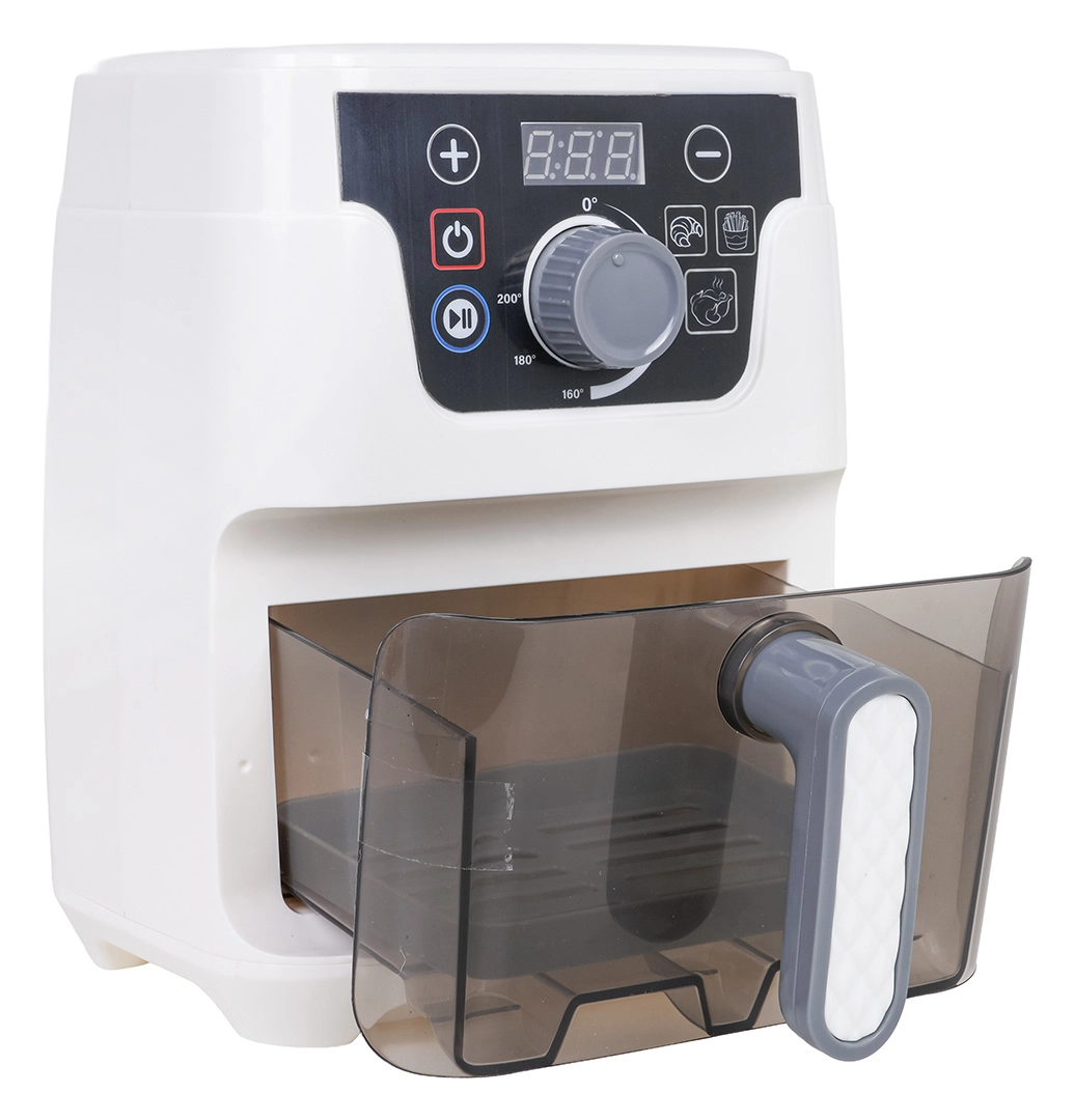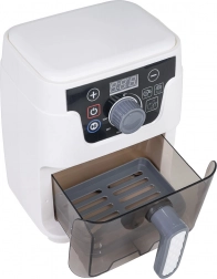 Ovaj detaljno izrađen dječji airfryer izgleda i ponaša se kao pravi uređaj: ima osvijetljenu košaru, digitalni zaslon i zvukove za pečenje, prženje i otvaranje/zatvaranje ladice. Automatski programi prikazuju vrijeme na zaslonu (pecivo 2:50, pomfrit 2:00, piletina 3:00), a po završetku ciklusa uređaj se sam isključuje uz akustičnu obavijest.