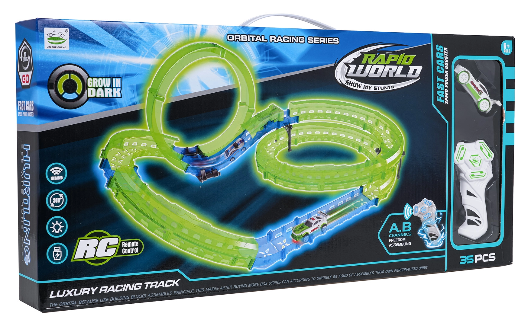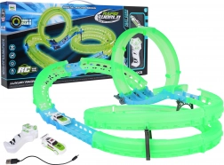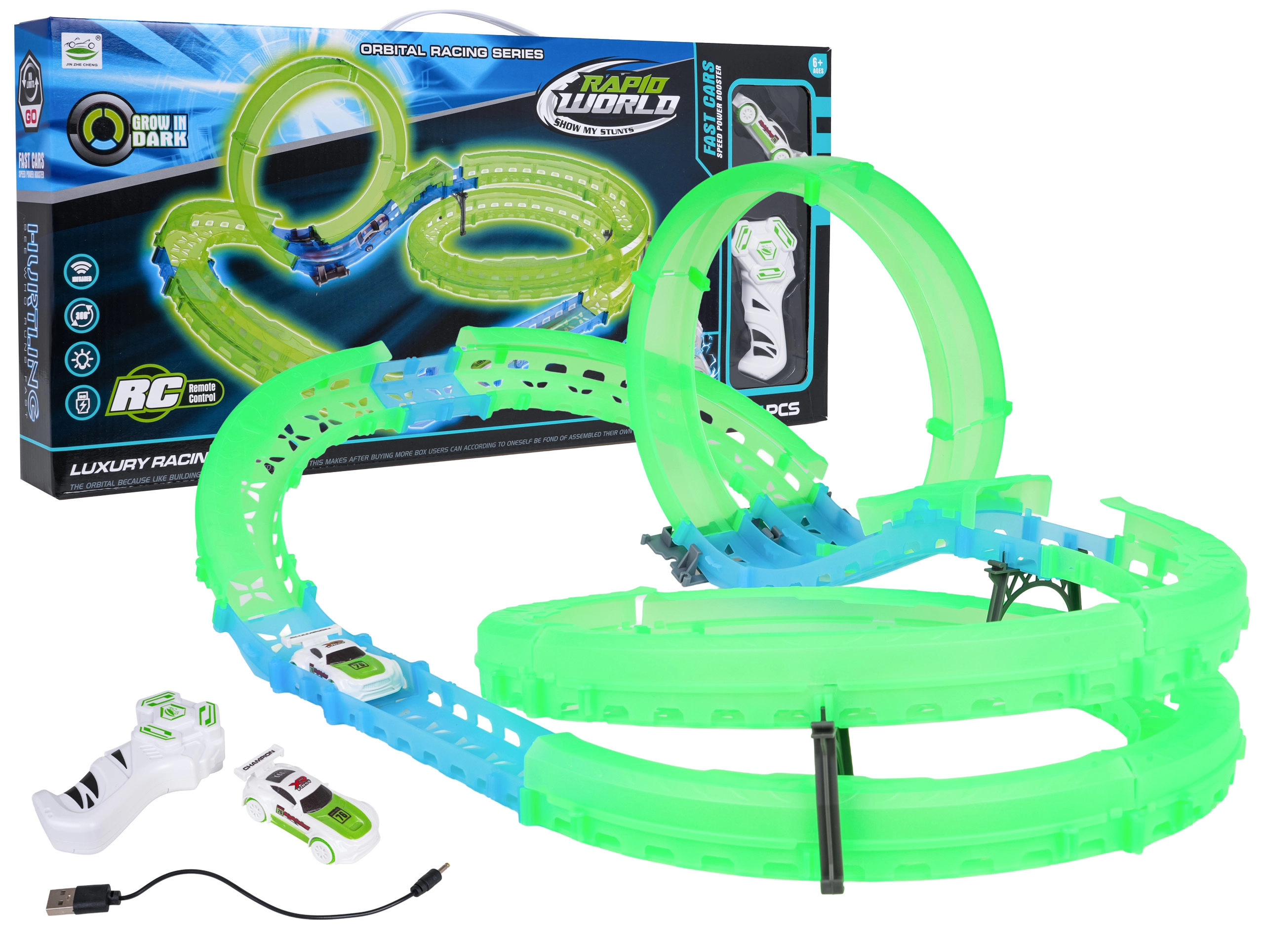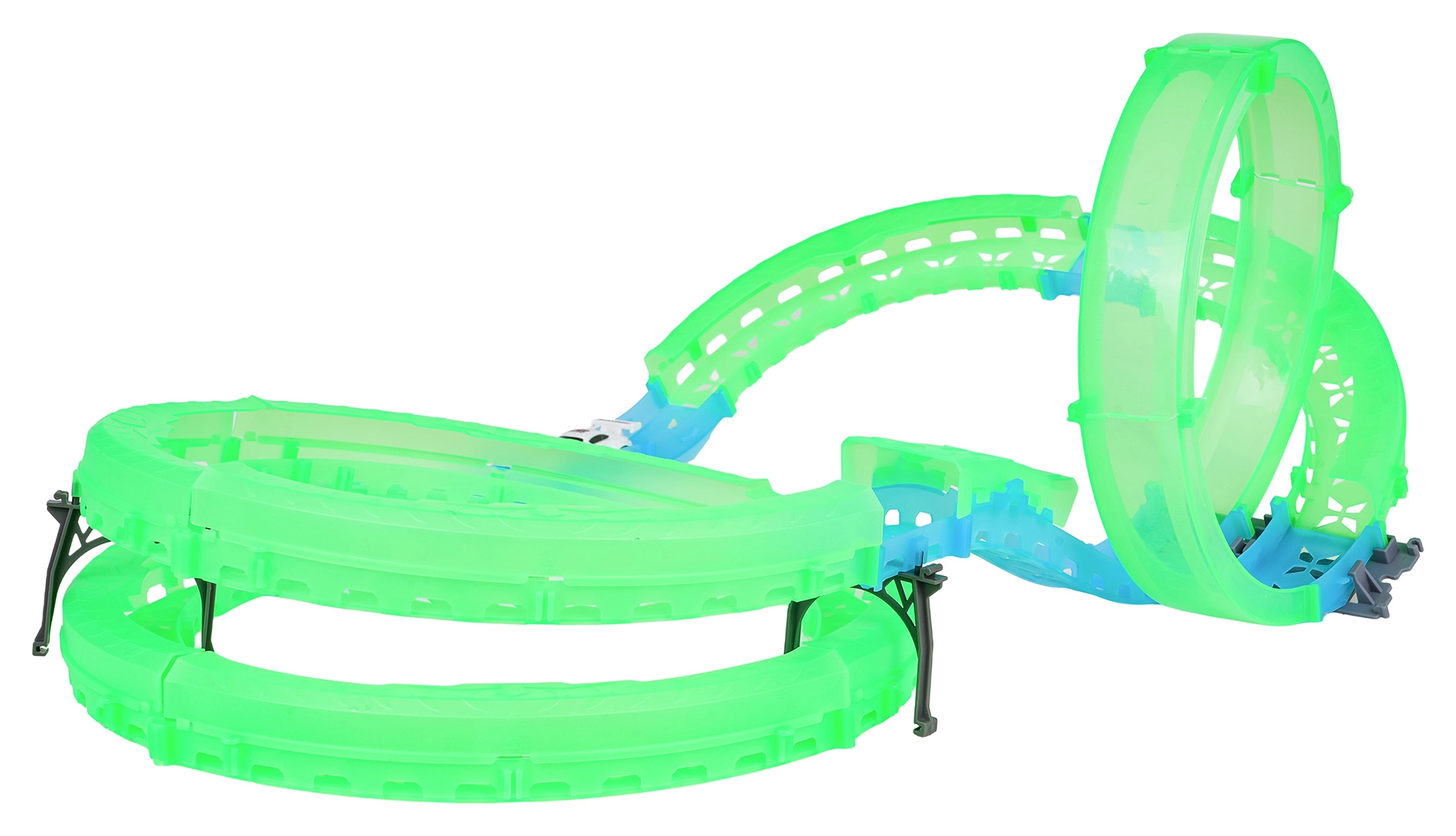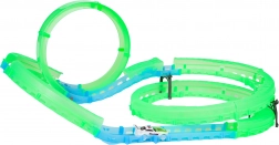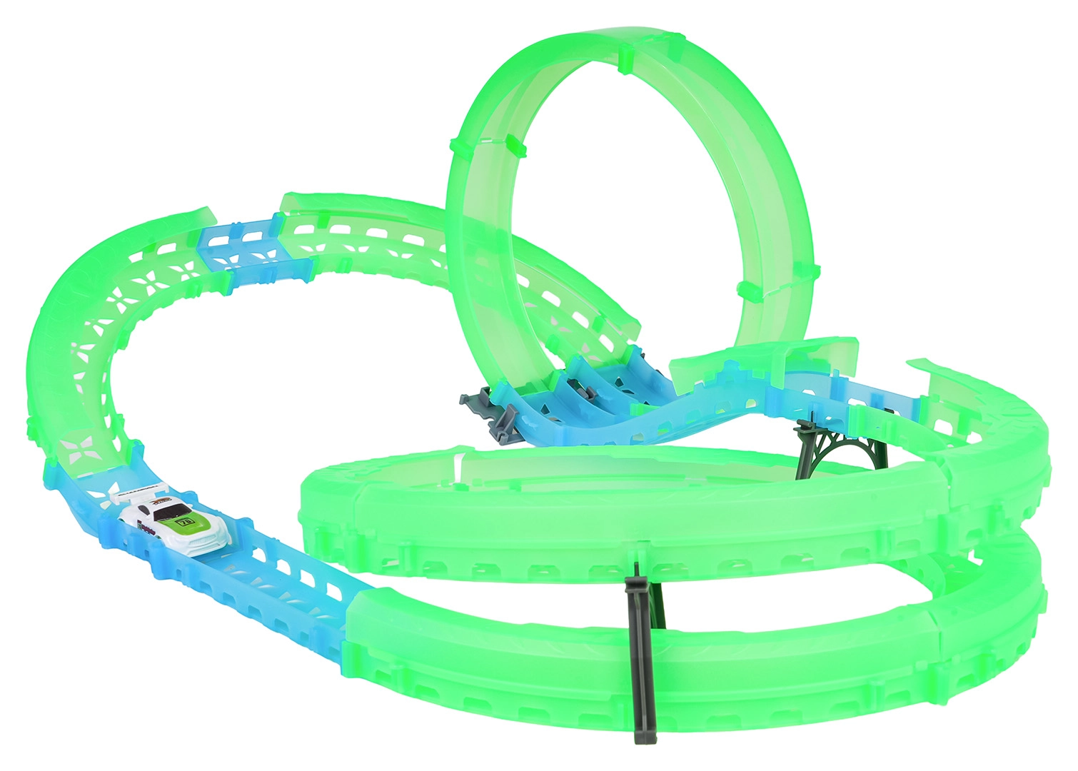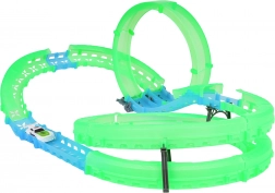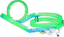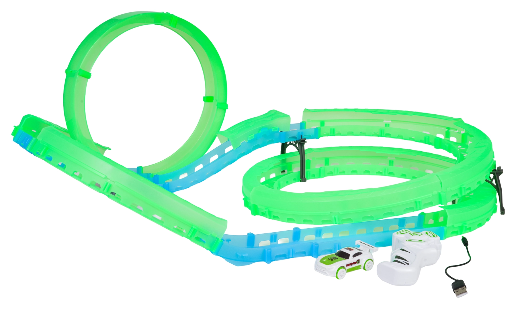 Ova velika svjetleća trkaća staza pretvara dječju sobu u akcijski krug. Fluorescentni dijelovi nakon izlaganja svjetlu prekrasno sjaje, a autić s LED efektima stvara svjetlosne tragove tijekom vožnje. Zahvaljujući jednostavnom spajanju dijelova, djeca lako slažu vlastitu stazu i odmah kreću u utrku.