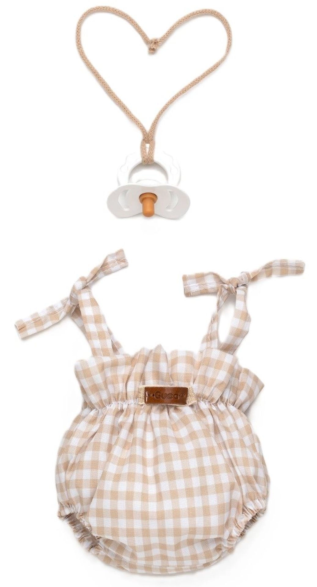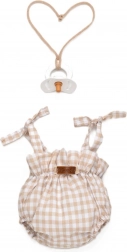 Bež-bijeli karirani romper s vezicama na ramenima, elastičnim nogavicama i naboranim strukom sigurno pristaje lutki i izgleda odlično na fotografijama.