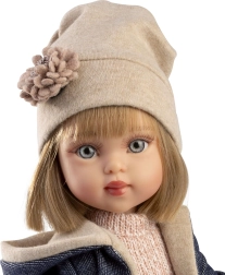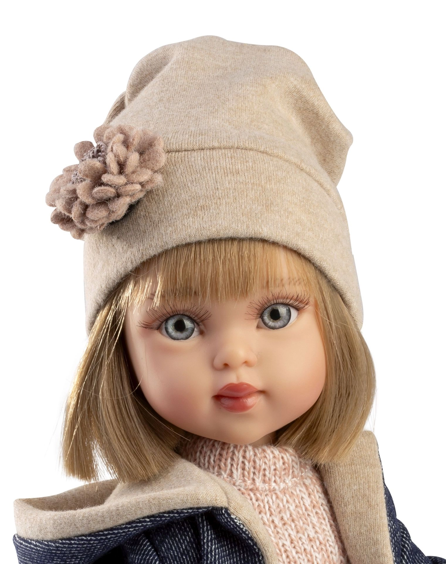 Stilski 5-dijelni set odjeće za lutku PENELOPE 34 cm sadrži haljinu, kapu, kaputić, dodatke i kožne cipelice na vezice. Ručno izrađeno u Španjolskoj od kvalitetnih materijala, idealno za kreativno presvlačenje i poticanje mašte djece od 3 godine naviše.