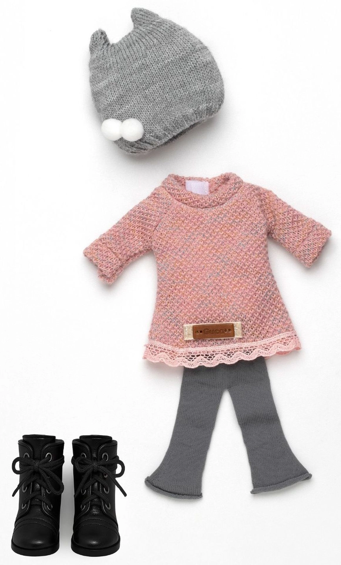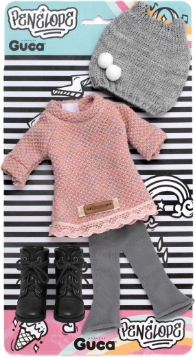 Priuštite svojoj lutki Penelope visine 34 cm novi ormar. Ovaj ručno izrađen set spaja nježan pleteni izgled i udobnost: ružičasta tunika s ukrasima, sive zvonaste tajice, siva kapa s dva pompona i crne vezane cipelice. Odjeća odlično pristaje i zahvaljujući promišljenim detaljima podržava kreativnu igru i stiliziranje.