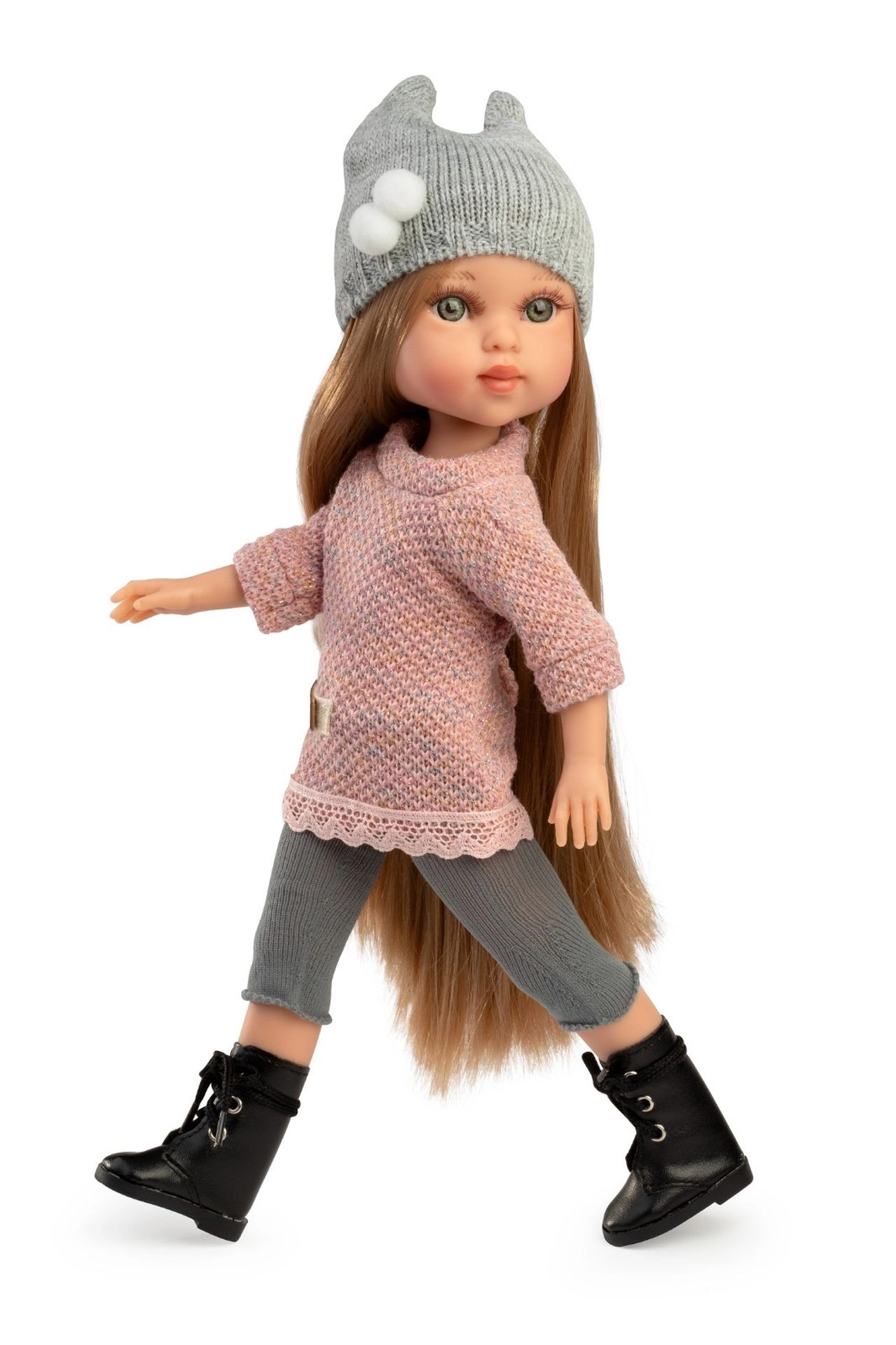 Set sadrži tuniku, tajice, kapu s pomponima i crne vezane cipelice – sve usklađeno u moderan izgled za lutke od 34 cm.