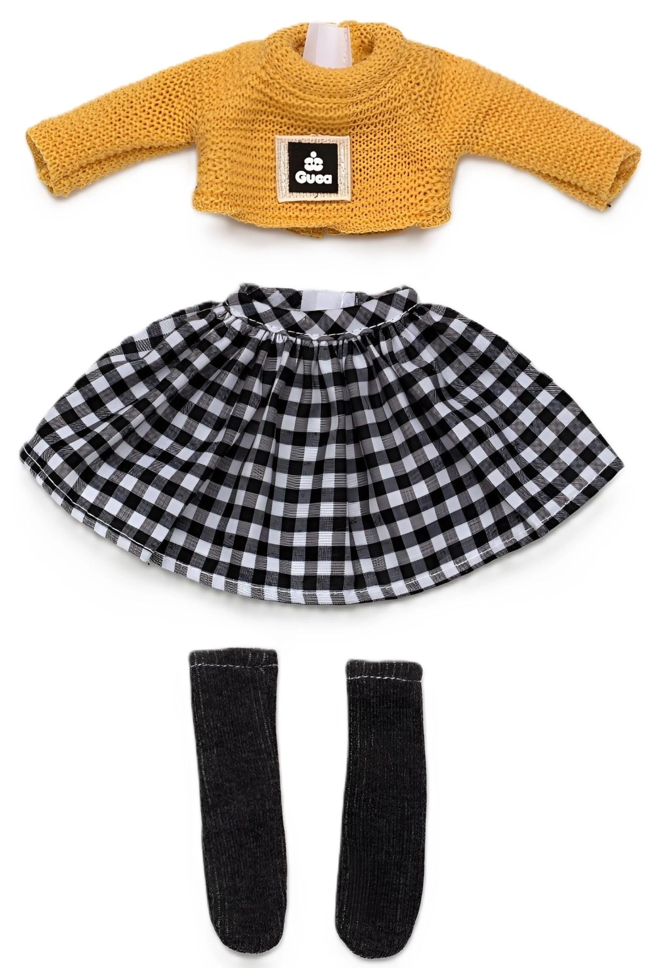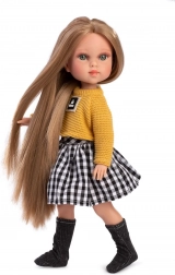 Stilski set odjeće za lutku Penelope 34 cm donosi ručni rad iz Španjolske, kvalitetne tkanine i lako presvlačenje. Sadrži pleteni žuti džemper, crno-bijelu kariranu suknju i tamnе čarape do koljena, idealno za kreativnu igru i stiliziranje. Pogodno od 3 godine.