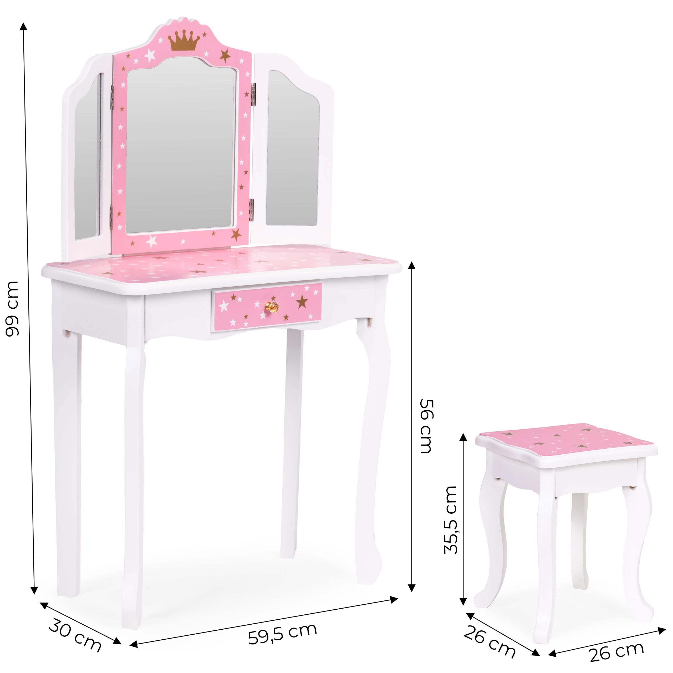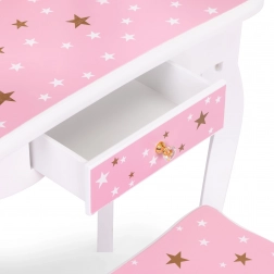 Elegantni dječji toaletni stolić ECOTOYS za male princeze nudi trostruko ogledalo, izvlačnu ladicu i udobnu stolicu. Stabilna drvena konstrukcija je sigurna za djecu od 3 godine, dok će nježan ružičasto-bijeli dizajn sa zlatnom krunom i zvjezdicama ukrasiti svaku dječju sobu. Idealan za kreativnu igru, vježbanje samostalnosti i održavanje reda.