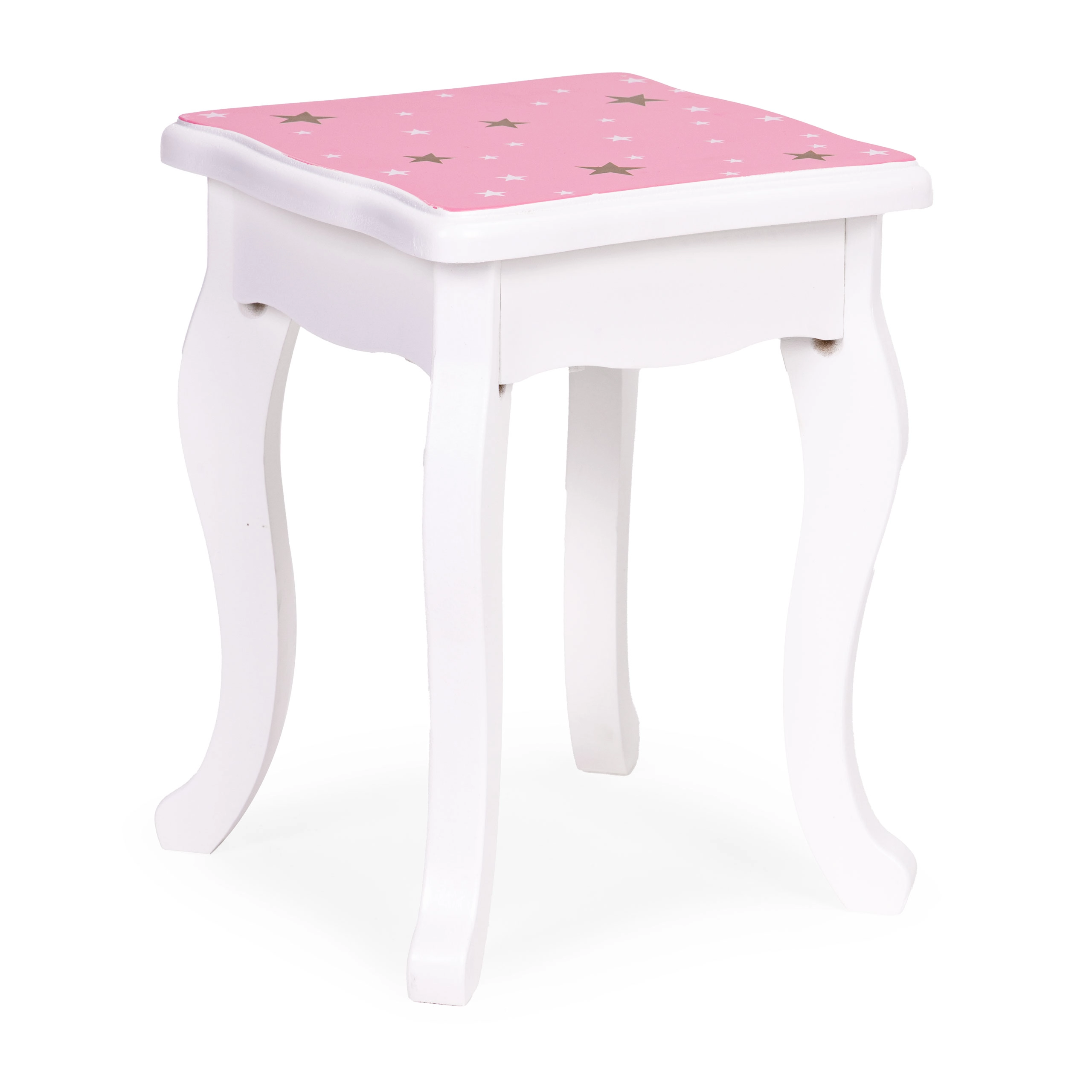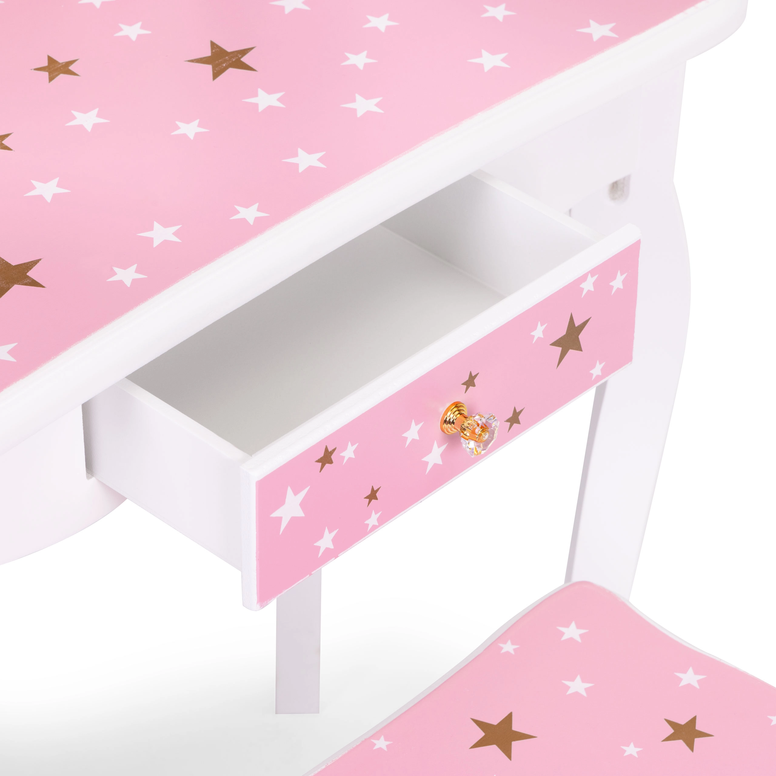 Zahvaljujući kvalitetnom drvu i MDF-u, stolić je čvrst i izdržljiv. Potiče finu motoriku, oko-ruka koordinaciju i samostalnost tijekom svakodnevne igre “salona ljepote” ili “princeze”. Suptilna ružičasta s motivima zvjezdica i krune uklapa se u većinu interijera.