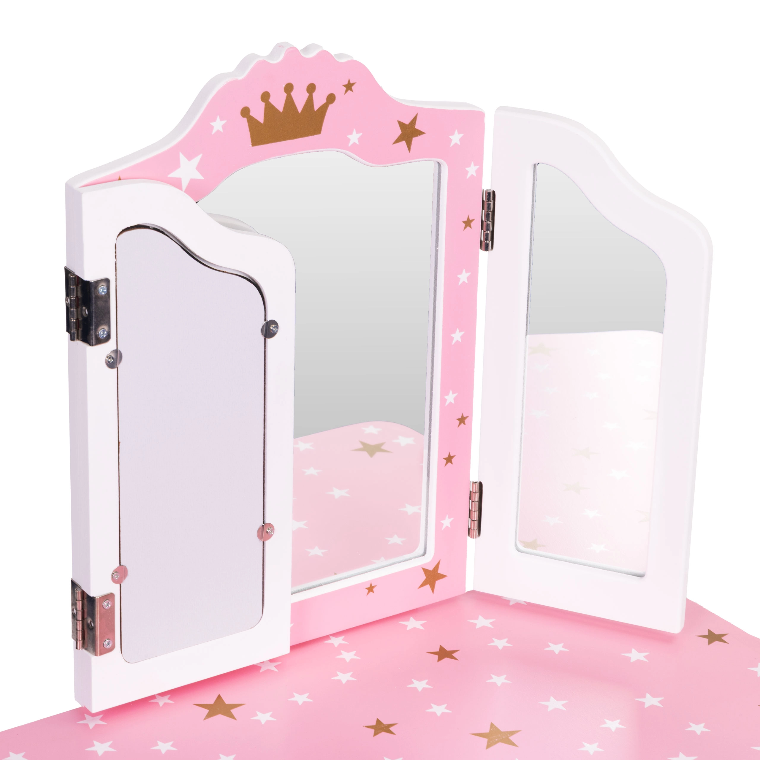 Veliko središnje ogledalo i dva preklopna bočna krila omogućuju djeci da se vide iz više kutova i povećavaju dojam realistične igre.