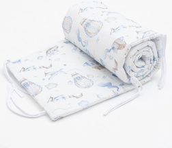 Praktična mantinela za dječji krevetić NEW BABY Romance s printom bajkovite avanture među oblacima. Pruža nježnu zaštitu od tvrdih rešetki, izrađena je od 100% pamuka s hipoalergenim punjenjem od poliestera i lako se pričvršćuje pomoću vrpci.