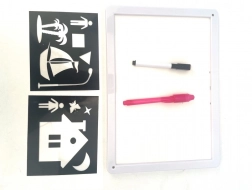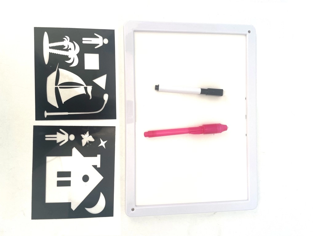 Zahvaljujući laganoj i prijenosnoj konstrukciji idealna je za dom i putovanja. U kompletu su šablone s oblicima (kuća, brod, raketa, likovi, mjesečevi motivi) koje potiču razvoj kreativnosti, mašte i fine motorike.