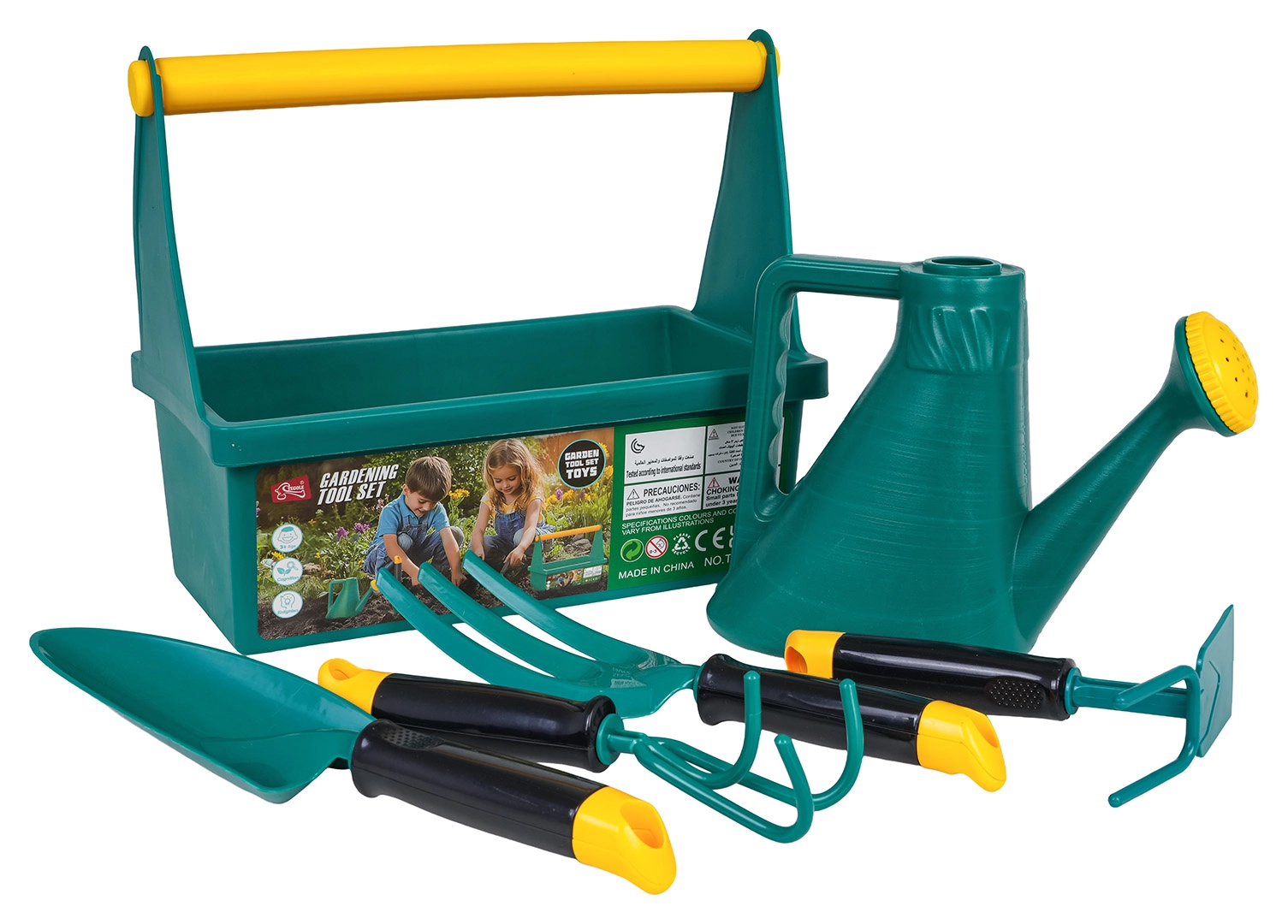 U setu se nalaze lopatica, grabljice, vilica/kultivator, kelna (žličica/špatula) i kanta za zalijevanje s uklonjivom ružom. Sve je izrađeno od kvalitetne, glatke plastike ugodne na dodir i lako se čisti. Idealno za igru u vrtu, na balkonu i u pijesku.