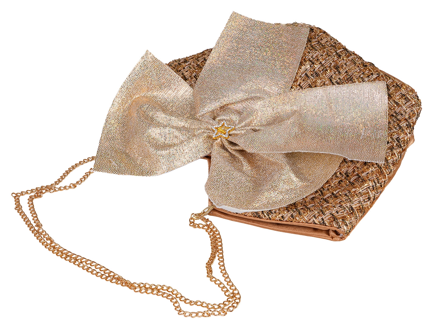 Prostrana sjajna torbica s lančanim remenom prima lutku i sitne dragocjenosti. Dijete je lako može ponijeti u grad, u posjet ili u vrtić.