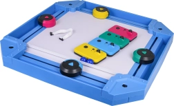 Robusna plastična arena s povišenim rubovima drži igru pod kontrolom, a šareni diskovi i paletni moduli dodaju preglednost i stil. Igraći elementi napajaju se akumulatorima 3,7 V (u pakiranju), a upravljači koriste baterije 2× AA 1,5 V (nisu uključene). Idealno kao poklon i odličan izbor za aktivnu zabavu bez ekrana.