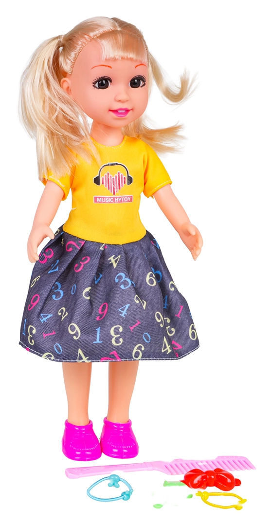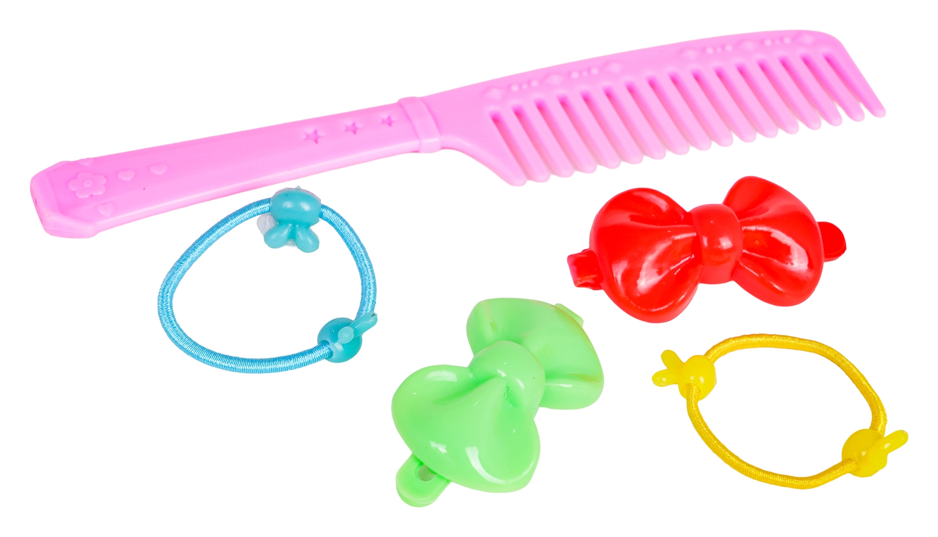 Češalj, dvije kopčice i dvije gumice omogućuju češljanje, ukrašavanje i mijenjanje izgleda lutke prema dječjoj mašti.