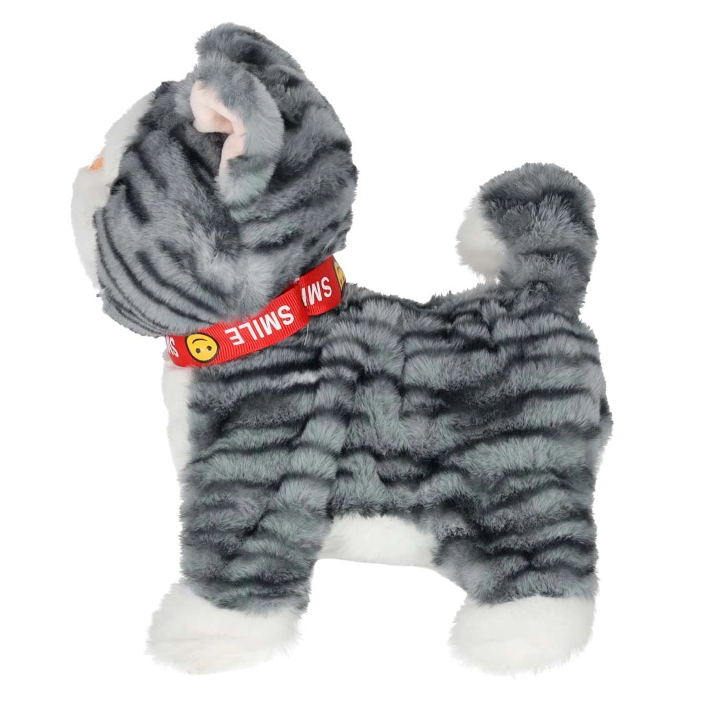 Svilenkasto sivo prugasto krzno, ružičaste uške i ovratnik s motivima daju igrački poseban izgled. Idealan suputnik za maženje.