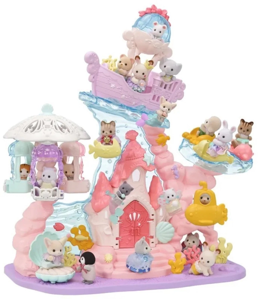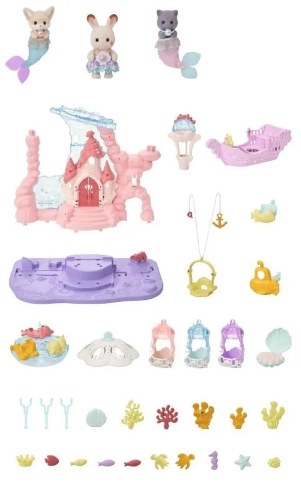 Otkrijte čarobnu podmorsku palaču SYLVANIAN FAMILIES koja će dječju sobu pretvoriti u carstvo mašte. Set nudi žičaru koja se vozi gore-dolje, vrtuljak s morskim stvorenjima, vožnju u podmornici i na žutoj ribici. U kompletu su tri baršunaste figurice djece s pokretnim zglobovima, škrinja s blagom, vrata koja se otvaraju i krevet u obliku školjke – idealno za kreativnu igru i razvoj fine motorike djece od 3 godine.