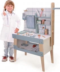 Ovaj role-play set potiče maštu, društvenu interakciju i pomaže smanjiti strah od posjeta liječniku. Realni rekviziti od kvalitetnog drva i drugih materijala uče djecu prepoznavati liječničke instrumente, planirati preglede i brinuti se o “pacijentima”.