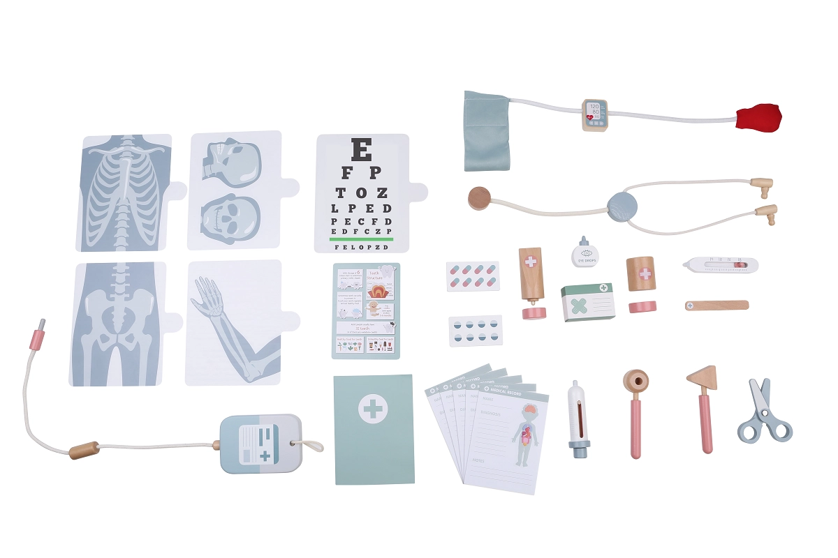 Stetoskop, tlakomjer, toplomjer, otoskop, štrcaljka, refleksno čekić, škare, pinceta, infuzija, kartice pacijenta, očna tablica, kartice s lijekovima i drugi dodaci za potpunu igru.