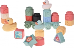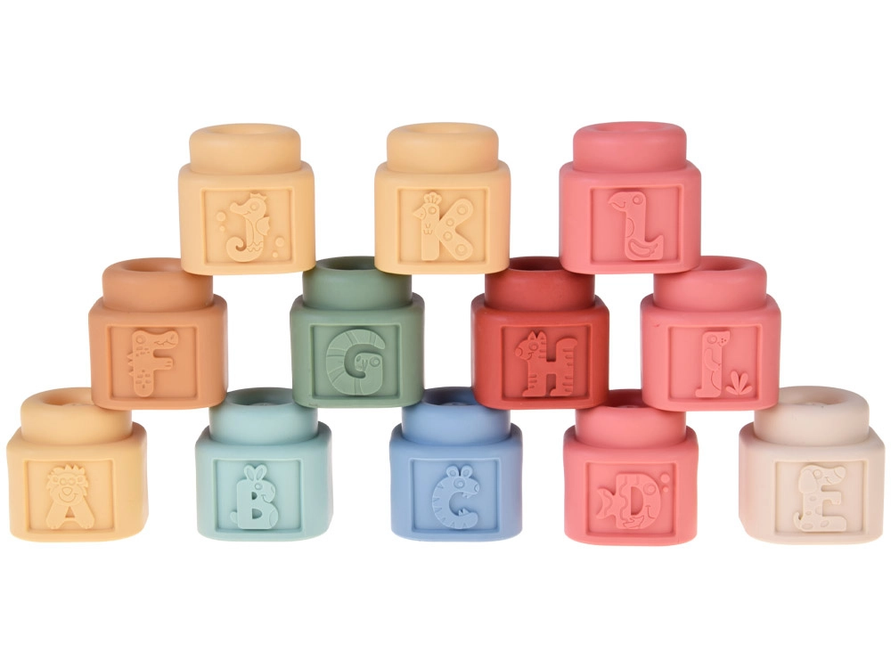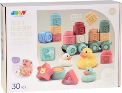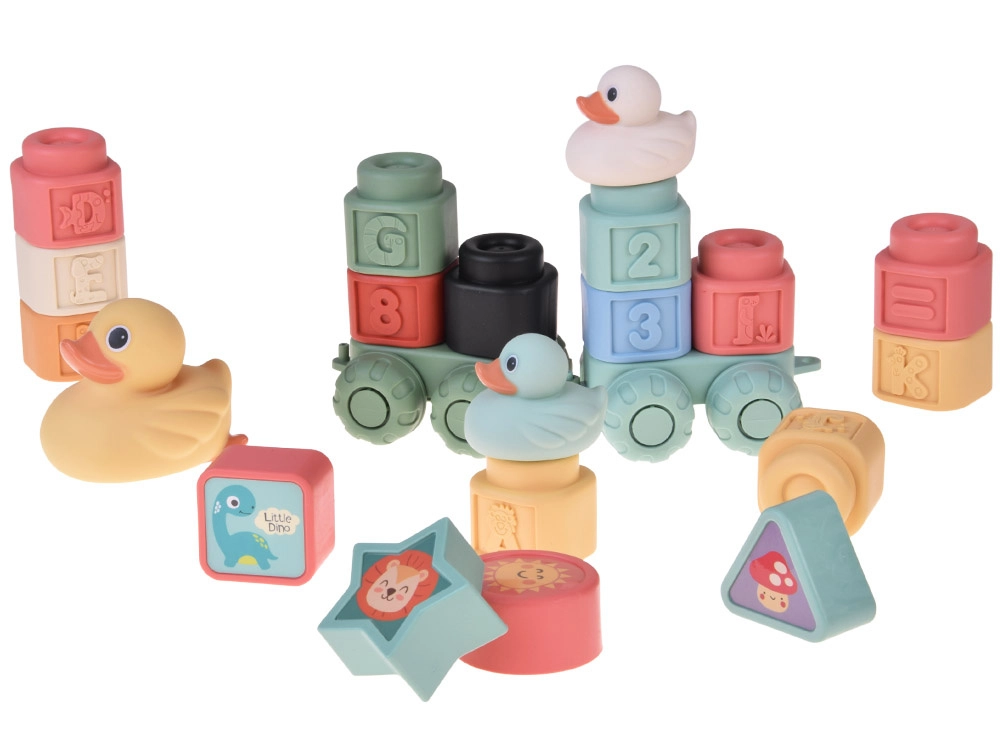 Zabavan i siguran set za najmlađe: mekane pastelne kocke s reljefnim slovima, brojevima i životinjama, dopunjene preslatkim pačićima za kupanje. Elastičan i netoksičan silikon/guma ugodan je na dodir, prikladan za male ručice i kao grickalica. Potiče finu motoriku, koordinaciju ruka–oko, učenje boja, oblika i brojeva te nudi puno kreativne zabave kod kuće i u vodi.