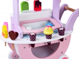 Štand ima podizni poklopac s unutarnjom pregradom za pohranu dodataka, ukrasnu prugastu tendu i čvrstu ručku za guranje ili povlačenje. Zahvaljujući kotačićima, djeca mogu otvoriti svoju mobilnu slastičarnicu bilo gdje – u sobi, na hodniku ili u vrtiću.