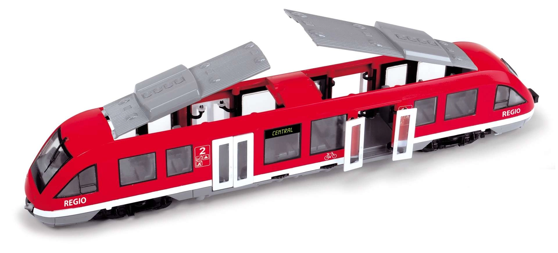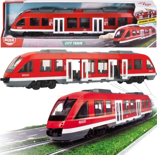 Realistični crveni gradski vlak REGIO marke DICKIE TOYS oduševit će male ljubitelje željeznice. Nudi vrata koja se otvaraju pomoću kotačića, slobodno okretna kola za glatku vožnju po ravnoj podlozi i detaljno izrađenu unutrašnjost sa sjedalima i vozačevom kabinom. Idealna igračka za djecu od 3 godine, s naglaskom na realistično izvedenje i izdržljivost.