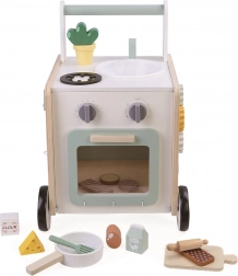 Ova multifunkcionalna drvena hodalica služi kao potpora pri prvim koracima i ujedno kao potpuno opremljen centar za igru s kuhinjskim dodacima. Djeca vježbaju koordinaciju oko–ruka, ravnotežu i finu motoriku dok otkrivaju svijet kuhanja i uloga. Okretni gumbići na pećnici ugodno klikaju, vrata se mogu otvoriti, a tu je i praktičan spremišni prostor za dodatke.