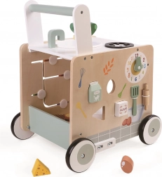 Zahvaljujući robustnom drvenom okviru hodalica je stabilna i izdržljiva, a gumirani kotači osiguravaju tih i siguran hod po podu. Sa sve četiri strane čekaju brojne aktivnosti: umetanje oblika (namirnica), okretni zupčanici, povrtni labirint, sudoper s pipom, ploča za kuhanje i prozirna pećnica. Hodalica je idealan poklon za mališane od 12 mjeseci.