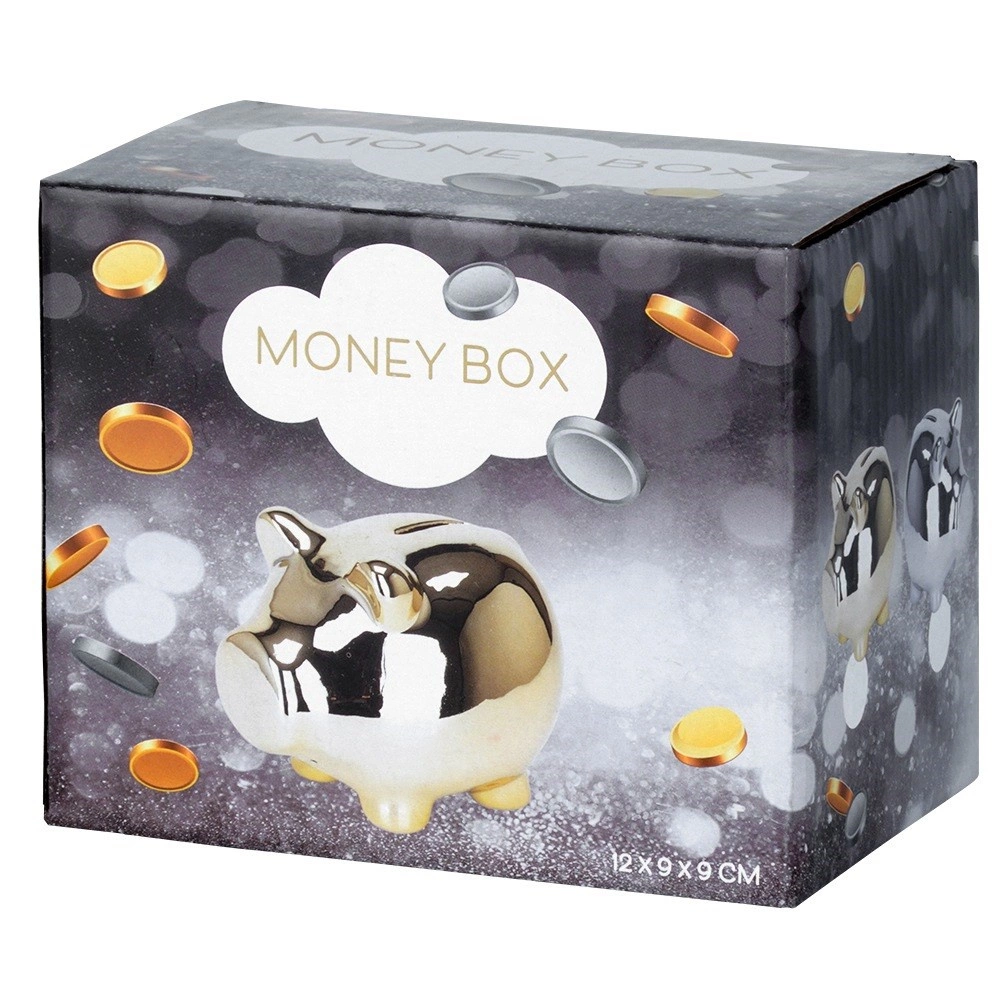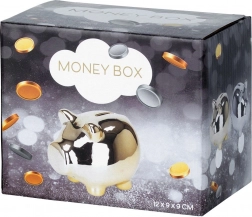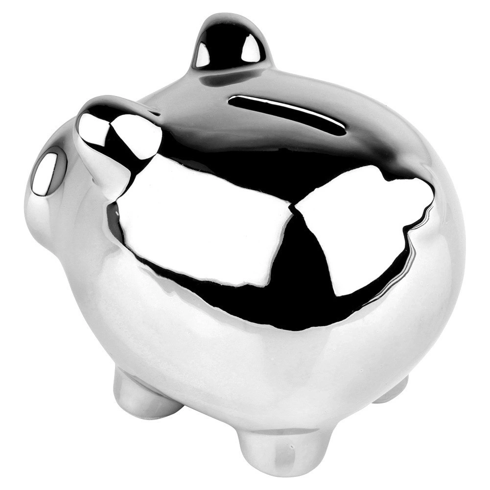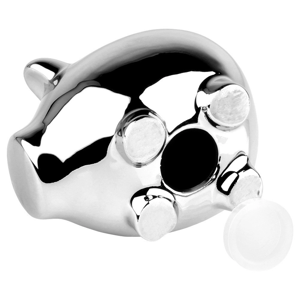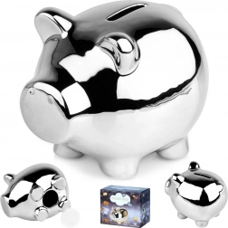 Elegantna kasica u obliku praseta s sjajnim srebrnim zrcalnim završetkom od keramike. Praktičan donji otvor s poklopcem omogućuje podizanje ušteđevine bez razbijanja. Kompaktne dimenzije 11,5 × 9 × 9 cm i moderan izgled čine kasicu stilskim dekorativnim dodatkom i sjajnim poklonom za djecu i odrasle.