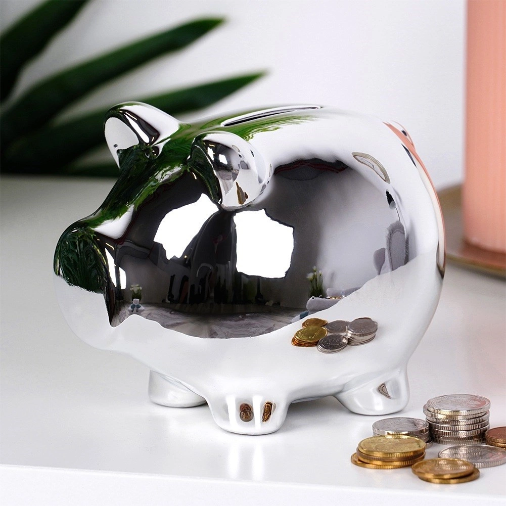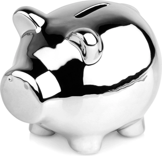 Stilska srebrna kasica u obliku praseta idealna je za pohranu kovanica i novčanica. Sjajna zrcalna izvedba daje svakom interijeru moderan štih i lako se uklapa u elegantan glamour stil. Donji otvor s poklopcem omogućuje udobno vađenje ušteđevine bez potrebe za razbijanjem kasice.