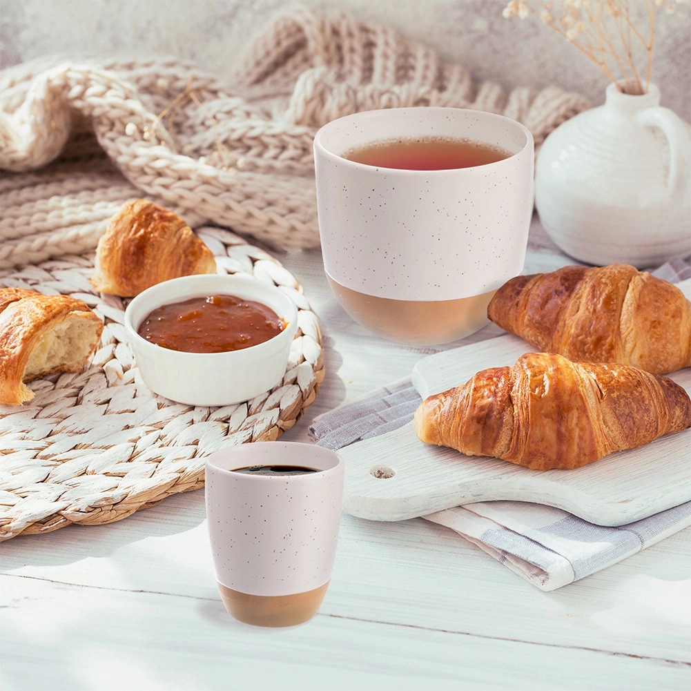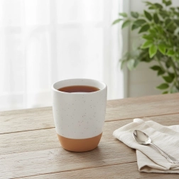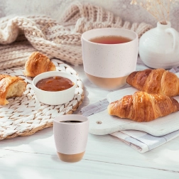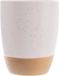 Uživajte u omiljenom espressu sa stilom. Ova mala šalica zapremnine 90 ml ima bezvremenski minimalistički izgled: gornji dio s nježnom bijelom točkastom glazurom glatko prelazi u prirodnu, neglaziranu kameninu. Deblje stijenke bolje zadržavaju temperaturu napitka, a udoban oblik odlično leži u ruci.