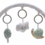 Odvojiva prečka s tri mekane igračke potiče koordinaciju i razvoj osjetila. Lako se skida za hranjenje ili spavanje.