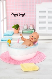 Tuš se može nagnuti u kadu kako se voda ne bi prskala okolo, a crijevo se može izvući za temeljito ispiranje lutke. Škropac patkicu i ružičasti jastučić moguće je pričvrstiti na različita mjesta po rubu kade – idealno za kreativne priče i razvoj njegovateljskih vještina.