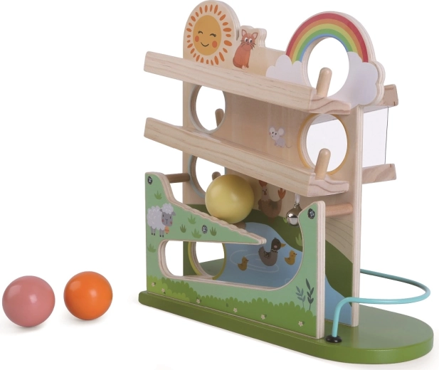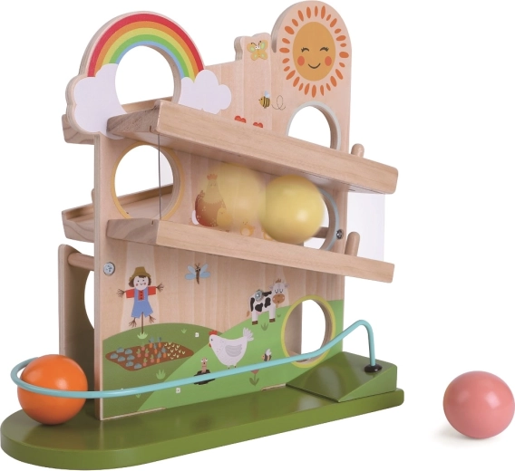 Ova kreativna staza za kuglice sa svježim seoskim dizajnom pretvara svaku igru u šaroliku avanturu. Djeca promatraju kako se kuglice spuštaju niz različito nagnute staze, nestaju u otvorima i ponovno se pojavljuju – sve to uz društvo veselih ilustracija sunca, duge i životinja. Stabilna baza i glatko obrađeni drveni dijelovi osiguravaju sigurnu manipulaciju i za najmlađe.