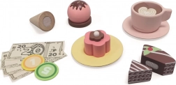 Set je izrađen od izdržljivog drva u nježnim pastelnim bojama i nudi bogat pribor: šalice s tanjurićima, žličice, pribor, kolači, sladoledi i drugi dodaci koji potiču igru uloga, razvoj fine motorike, socijalnih vještina i jezičnog izražavanja.