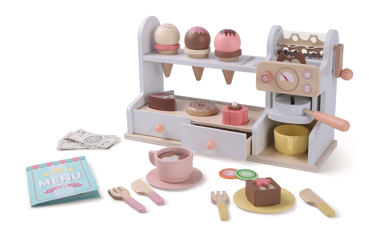 Ova stilska drvena slastičarnica i kafić 2 u 1 pretvara dječju sobu u mali bistro. Kompaktni pult s aparatom za kavu, vitrinom za deserte i policom s otvorima za kuglice sladoleda poziva na beskrajnu zabavu. U kompletu je i ladica za plaćanje s lažnim novcem, pa djeca mogu vježbati posluživanje i naplatu.