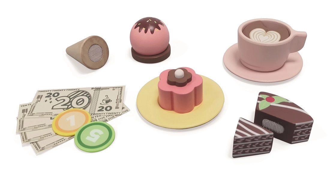 Šalice s tanjurićima, deserti, kuglice sladoleda, pribor, kovanice i novčanice – ukupno 46 dijelova za mnoštvo scenarija.