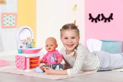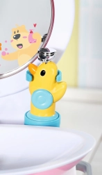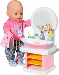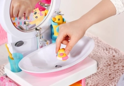 Zabavni umivaonik za lutku BABY born pretvara svakodnevnu higijenu u igru. Pritiskom na gumb ogledalo se osvijetli i pokrene se melodija kao timer za pranje ruku. Dozator sapuna, tekuća voda pri pritisku na slavinu i čep u obliku pačića čine igru realističnim doživljajem. U kompletu su četkica za zube, čašica sa zvukovima čišćenja zubi i ručnik.