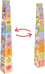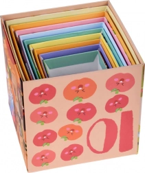 Zabavna i pametna igračka za male istraživače: set od 10 šarenih kartonskih kocaka za slaganje tornjeva i umetanje jedna u drugu. Ilustracije s voćem i brojevima 1–10, prijevoznim sredstvima i životinjama u zanimanjima potiču razvoj rječnika, logike i fine motorike. Izdržljiva izrada od kvalitetnog tvrdog kartona i lako spremanje zahvaljujući umetanju jedna u drugu.
