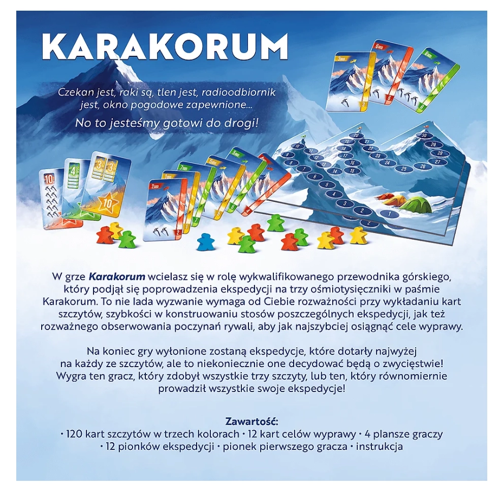 Postanite kralj planina u atmosferičnoj igri KARAKORUM: King of the Mountains. U ulozi vođe ekspedicije birate pravi trenutak za odigravanje karata vrhova, pažljivo slažete špilove pojedinih pohoda i prilagođavate se promjenama tempa protivnika. Svaka odluka približava vaš tim cilju – osvajanju triju legendarnih osamtisućnjaka.