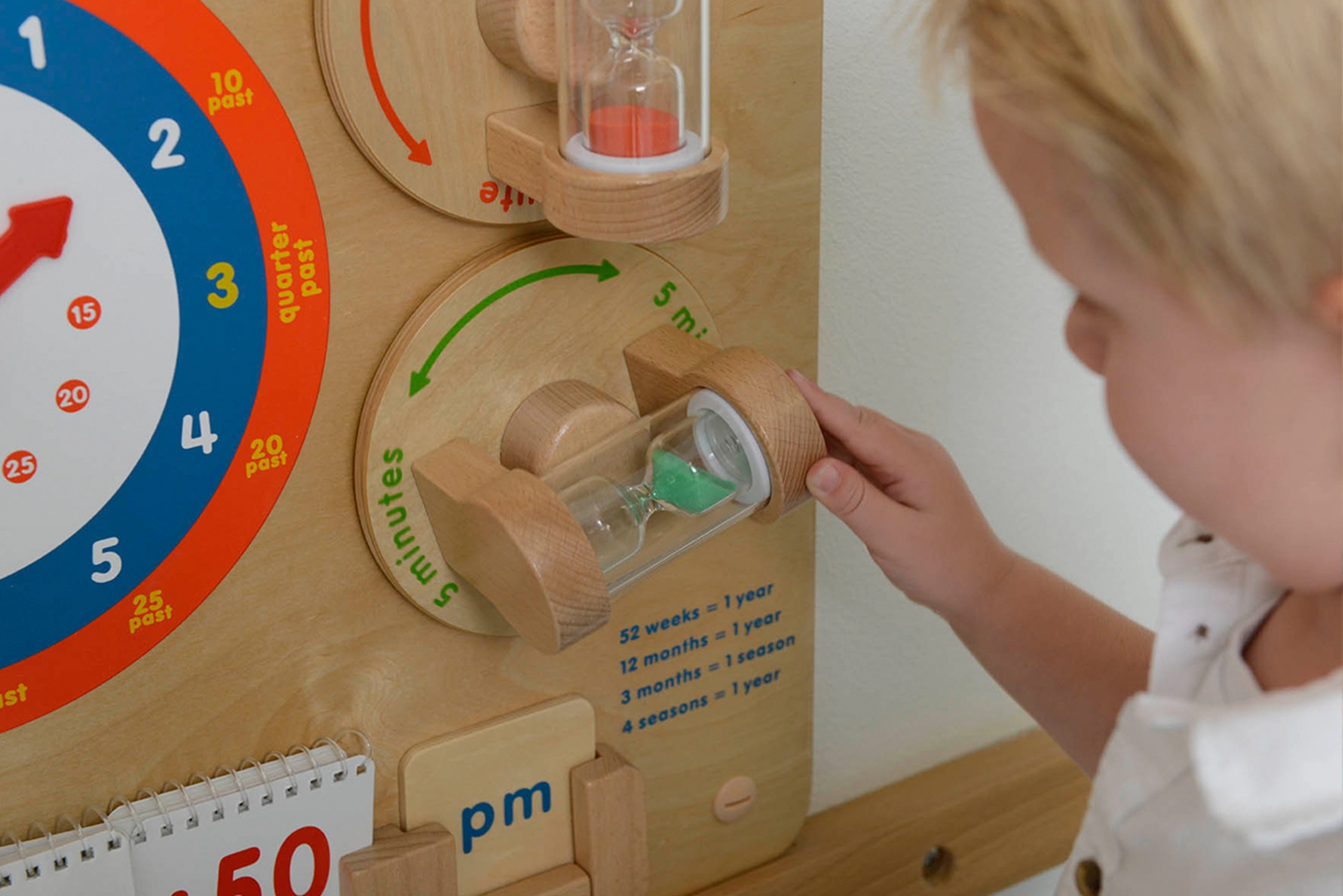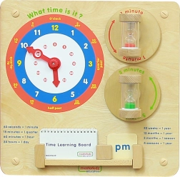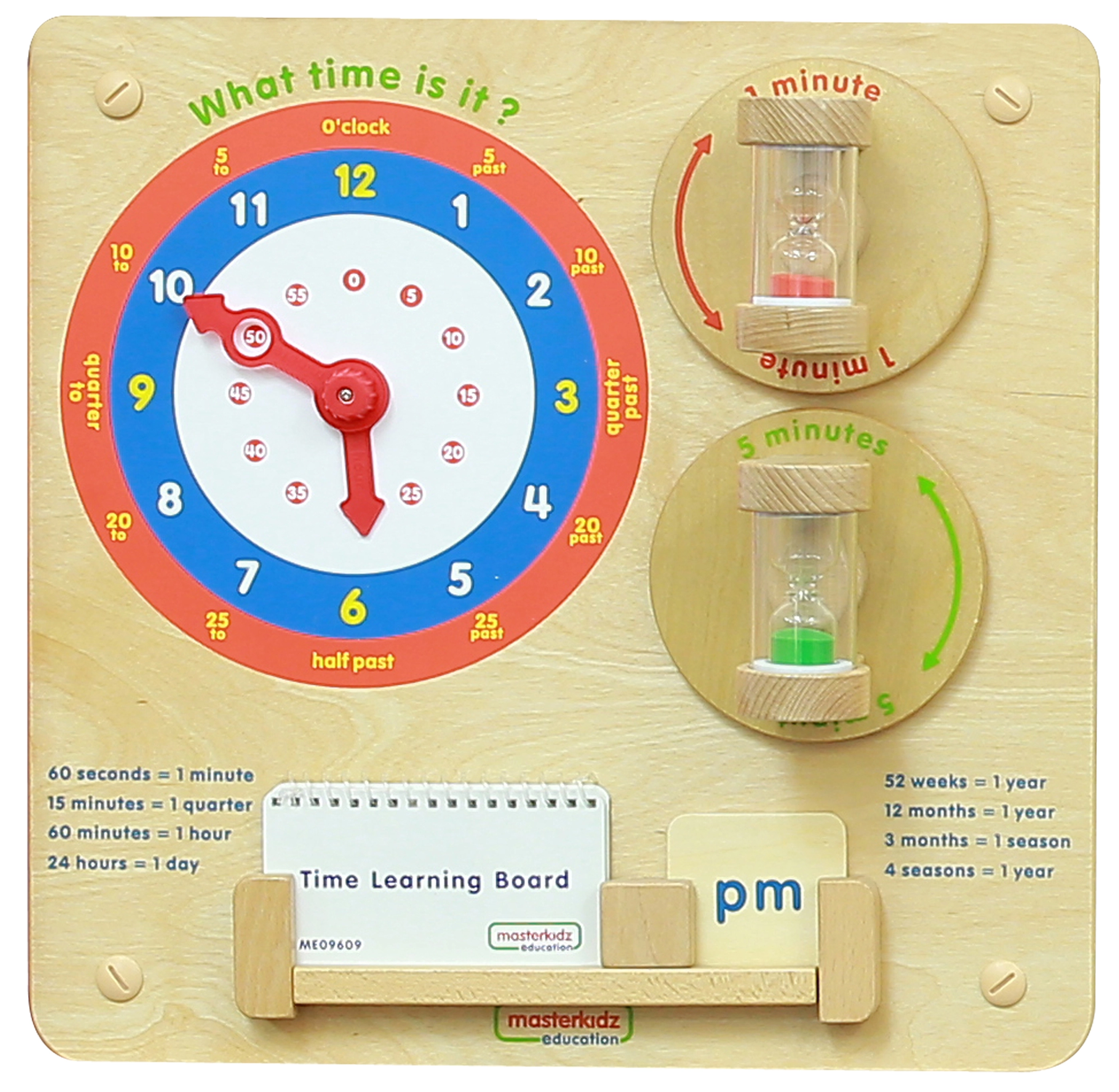 Drvena obrazovna ploča MASTERKIDZ uči djecu kako čitati vrijeme s klasičnog sata, razumjeti minute, sate i dane te doživjeti trajanje vremena pomoću dva pješčana sata (1 i 5 minuta). Izdržljiva konstrukcija za zid ili za sustav Masterkidz Flex, pomične kazaljke i pregledne oznake potiču logičko razmišljanje, finu motoriku i samostalnu igru.